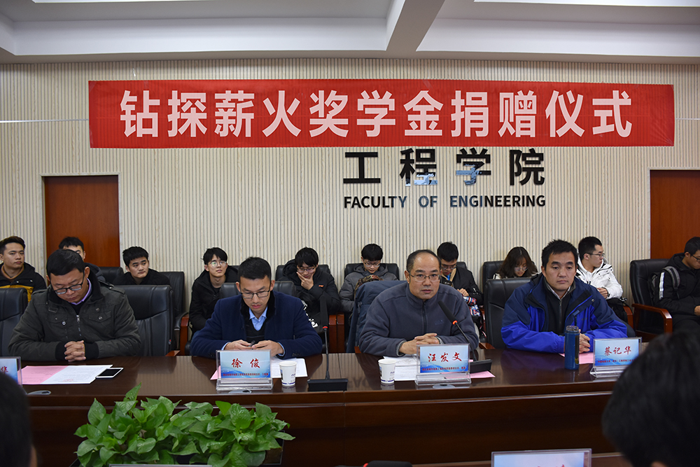 汪发文介绍建立奖学金的初衷和原由,衷心感谢学院和勘基系老师一直以来对城市地质工程院工作的支持,并与同学们分享了个人工作经历和对钻探专业的深刻认识。他希望同学们要有家国情怀,坚定专业自信,用心钻研、脚踏实地学好专业知识,并将这种自信与情怀薪火相传继往开来。