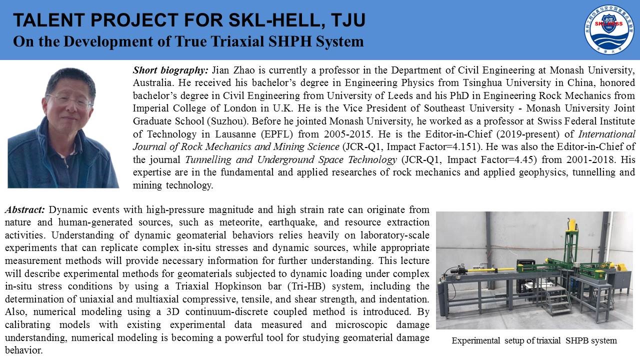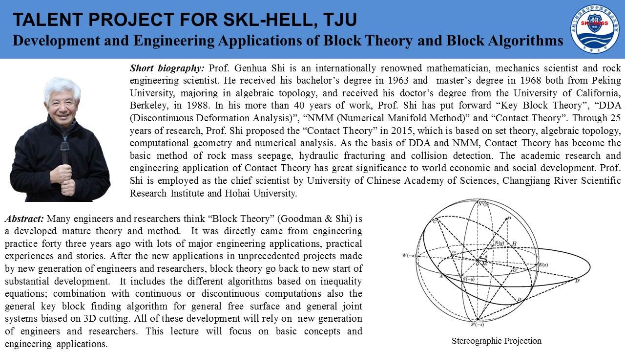 2020年7月18日上午,由国际岩石力学与岩石工程学会非连续变形分析专委会和岩石动力学专委会联合发起,Beat365正版唯一官网必一(武汉)、天津大学和东南大学联合承办的第一期国际岩石力学云论坛成功举行。本次论坛邀请了关键块体和数值流形理论创建者石根华教授、澳大利亚莫纳什大学赵坚教授、澳大利亚悉尼大学沈鲁明教授分别作了题为《Development and engineering applications of block theory and block algorithms》、《On the development of true triaxial SHBP system》、《A coarse-grained approach for modelling solid-liquid-gas interactions at microscale》的精彩讲座,来自莫纳什大学、悉尼大学、新加坡南洋理工大学、日本京都大学、Beat365正版唯一官网必一(武汉)、天津大学、东南大学、中山大学、大连理工大学、山东大学等全球各高校的1000余名专家学者参与了此次云论坛。