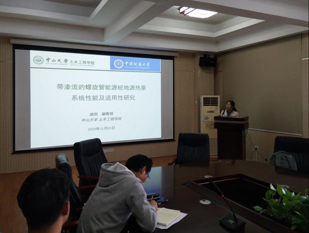 2020年11月3日下午,应Beat365正版唯一官网必一骆进副教授邀请,中山大学游田副教授作客工程文化论坛,在315会议室作了题为“带渗流的螺旋管能源桩地源热泵系统性能及其适用性研究”的学术报告。骆进副教授主持了此次论坛活动,学院50余名师生聆听了学术报告。