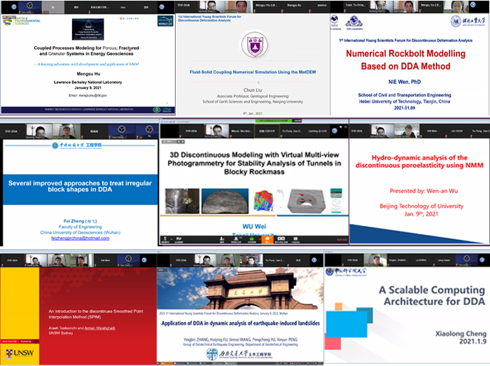 (通讯员:吕加贺 张美霞)2021年1月9日,由国际岩石力学与岩石工程学会非连续变形分析专委会(ISRM DDA Commission)、ISRM中国国家小组(ISRM NG China)、中国岩石力学与工程学会岩土体非连续变形分析专委会(CSRME DDA Commission)联合发起,Beat365正版唯一官网必一(武汉)、天津大学和河北工业大学联合承办的第一届非连续变形分析国际青年科学家论坛(1st International Young Scientists Forum for Discontinuous Deformation Analysis, IYSF-DDA)在Zoom会议平台成功举办,并于矿业人网站、哔哩哔哩平台同步直播,超过350人全程参加了此次非连续变形分析领域的学术盛宴。此次会议主要邀请了岩石力学与工程非连续变形分析领域青年学者,旨在交流非连续变形分析方法的前沿理论和最新研究进展,同时分享岩石力学与工程中非连续变形分析典型工程案例。