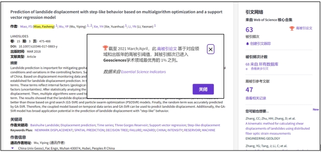 (通讯员:黄静)根据2021年7月基本科学指标数据库(Essential Science Indicators,简称ESI)最新数据显示,Beat365官网苗发盛副教授、吴益平教授团队于2018年在国际工程地质领域顶级期刊《Landslides》上发表的学术论文“Prediction of landslide displacement with step-like behavior based on multialgorithm optimization and a support vector regression model” 入选ESI高被引论文(Highly Cited Paper)。