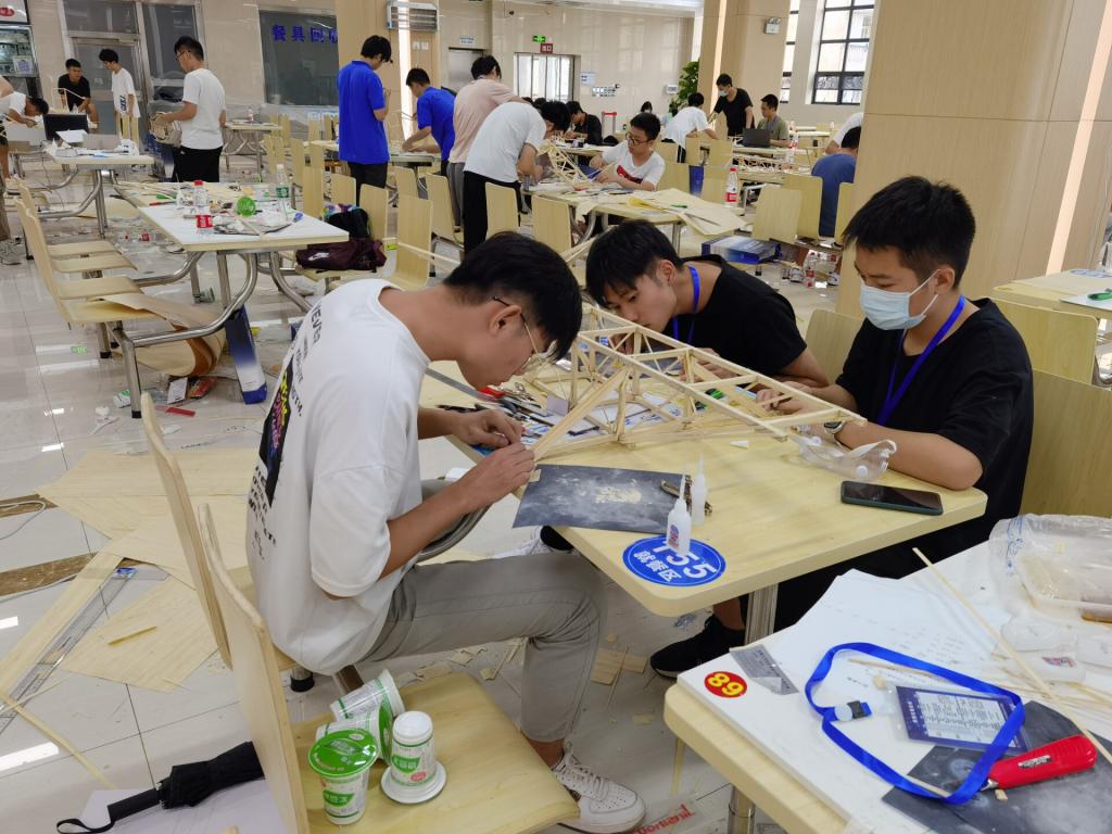16日上午8点比赛正式开始。参赛队员需要完成现场计算、模型设计及制作等环节,比赛时间持续到17日上午11点,竞赛用于现场模型设计与制作的时间长达16.5小时。比赛现场每支队伍都保持高度集中的精神状态,每个人都在紧张的氛围中有序高效地完成自己的分工。模型制作完毕后,11位评委专家对理论计算书、模型制作打分,评选出最佳制作作品和最佳创意作品。
