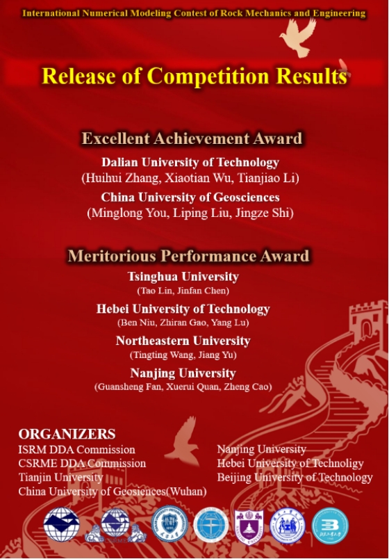 本次大赛由国际岩石力学与岩石工程学会非连续变形分析专委会(ISRM DDA)联合中国岩石力学与工程学会岩土体非连续变形分析专委会(CSRME DDA)及Beat365正版唯一官网必一(武汉)、天津大学、南京大学、北京工业大学、河北工业大学等多所高校联合举办,于2021年第十一届亚洲岩石力学大会(ARMS11)期间同步举行。大赛鼓励研究生对岩石力学问题的现有数值方法和软件进行公开、透明和广泛的验证,为共享岩石力学问题的实验和数值结果提供平台。