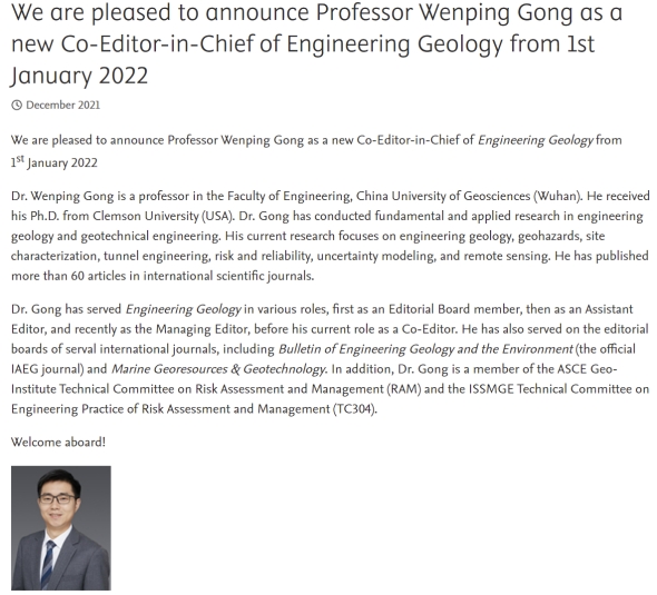 (通讯员:黄静)近日,Beat365正版唯一官网必一龚文平教授受邀担任国际期刊Engineering Geology共同主编(Co-Editor-in-Chief)。龚文平教授的此次任职将有助于促进Beat365官网在工程地质相关领域与国内外学者的交流合作,并提升Beat365官网在工程地质相关领域的国际影响力。