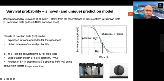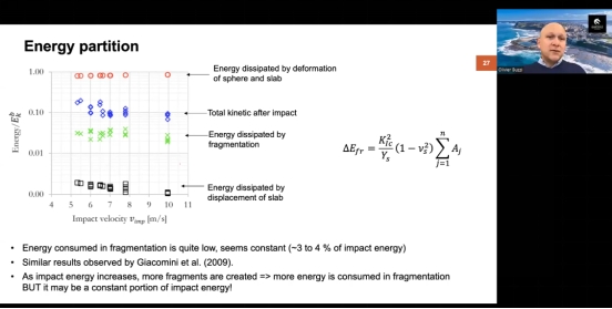 Olivier Buzzi教授报告主题为“experimental and theoretical insights into the fragmentation of rocks upon impact in the context of rockfall”。以崩塌落石为研究背景,Olivier Buzzi教授阐述了碰撞破碎对落石灾害的重要作用。通过自行设计研发的室内试验装置,采用三维高速摄像技术,首次观测到块石碰撞破碎全过程及碰后碎片的运动规律。并针对不同形状脆性块石开展了大量室内试验研究,系统揭示了块石碰撞破碎模式、碎片尺寸、破碎概率及能量耗散的规律。研究表明虽然碰撞破碎仅会耗散3%-5%的总能量,但破碎显著改变碎片运动轨迹;碰后碎片速度与质量没有明确的相关性,但碰后碎片动能与碎片质量呈现显著正相关规律。脆性块石的形状和碰撞角度也显著影响碰撞破碎概率和破碎模式。基于大量的室内试验成果,Olivier Buzzi教授提出了一种新的破碎概率模型。该模型考虑了块石形状、尺寸和应变率对破碎概率的影响,首次准确预测了破碎概率与冲击能量的线性相关性。基于该模型,Olivier Buzzi教授揭示了弹性模量、泊松比、巴西劈裂强度等对临界破碎功的影响。在最后的总结中,Olivier Buzzi教授强调了考虑碰撞破碎对于准确预测落石至关重要,但相关研究还很不充分,急需进一步研究从而提出简单可靠的破碎概率模型,并引用于落石运动轨迹分析中。