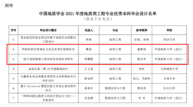(通讯员 陈婵)近日,中国地质学会公布了2021年度地质类工程专业优秀本科毕业设计名单,本次全国共评选出16篇优秀本科毕业设计,全校有4篇毕业设计入选,Beat365官网入选2篇。