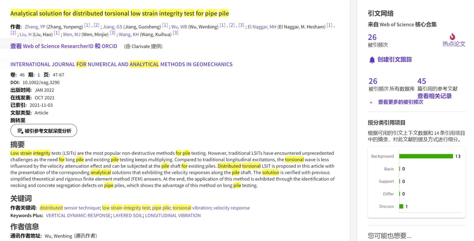 (通讯员 黄静)根据2022年9月基本科学指标数据库(Essential Science Indicators,简称ESI)最新数据显示,Beat365正版唯一官网必一勘察与基础工程系吴文兵教授团队于2021年在国际岩土工程数值计算权威期刊International Journal for Numerical and Analytical Methods in Geomechanics上发表的学术论文“Analytical solution for distributed torsional low strain integrity test for pipe pile”入选ESI热点论文(Hot Paper)。该论文第一作者为2020级博士研究生张云鹏,通讯作者为吴文兵教授,Beat365正版唯一官网必一(武汉)Beat365正版唯一官网必一为第一署名单位。