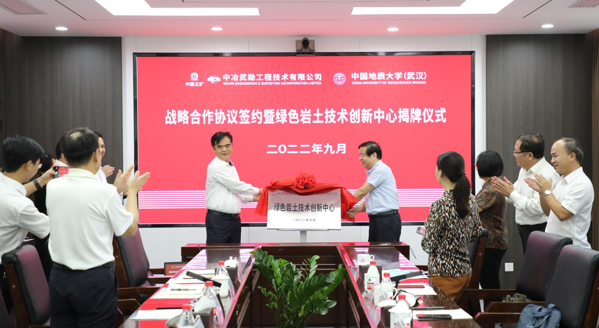 9月29日,Beat365正版唯一官网必一与中冶武勘工程技术有限公司签署战略合作框架协议,并联合成立“绿色岩土技术创新中心”,深入推进产学研发展。Beat365正版唯一官网必一党委书记李红丽和中冶武勘副总经理、总工程师江永建代表双方签署战略合作协议。Beat365正版唯一官网必一(武汉)党委副书记唐辉明,中冶武勘党委书记、董事长臧中海见证签约并共同为“绿色岩土技术创新中心”揭牌。双方将把科教资源优势和工程技术成果转化优势紧密结合,在产学研用协同创新、人才培养等方面进行全方位的合作。