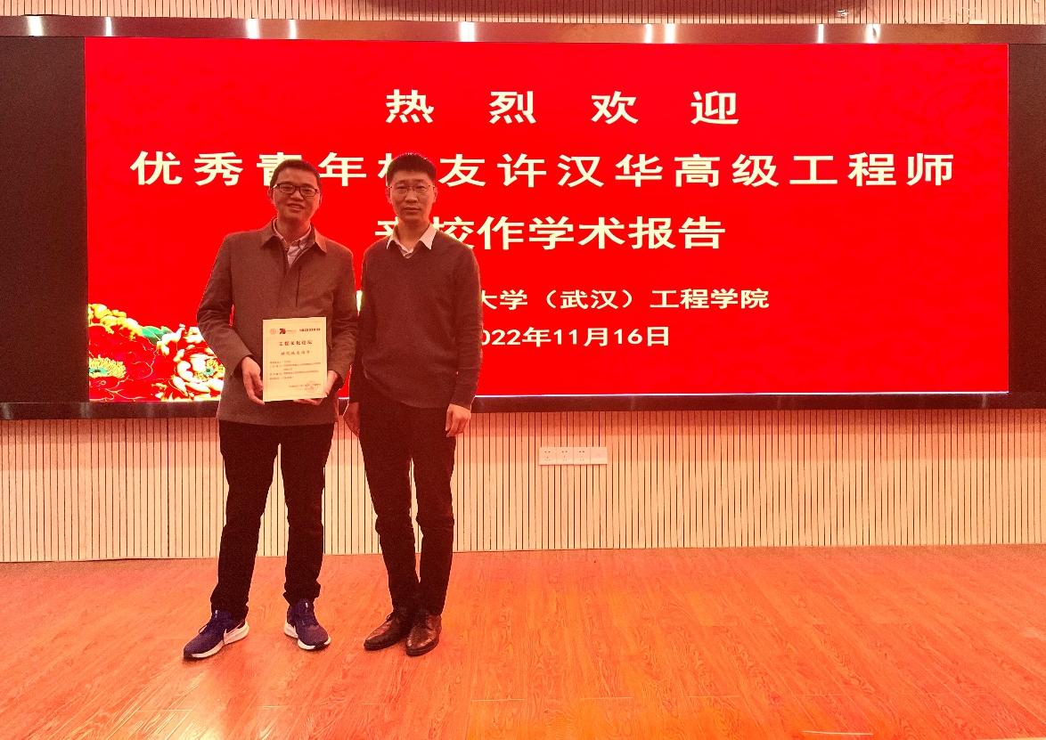 邹俊鹏特任教授对报告进行了总结发言,向许汉华高级工程师颁发了Beat365正版唯一官网必一(武汉)70周年校庆系列学术活动工程文化论坛特邀报告证书,并合影留念。