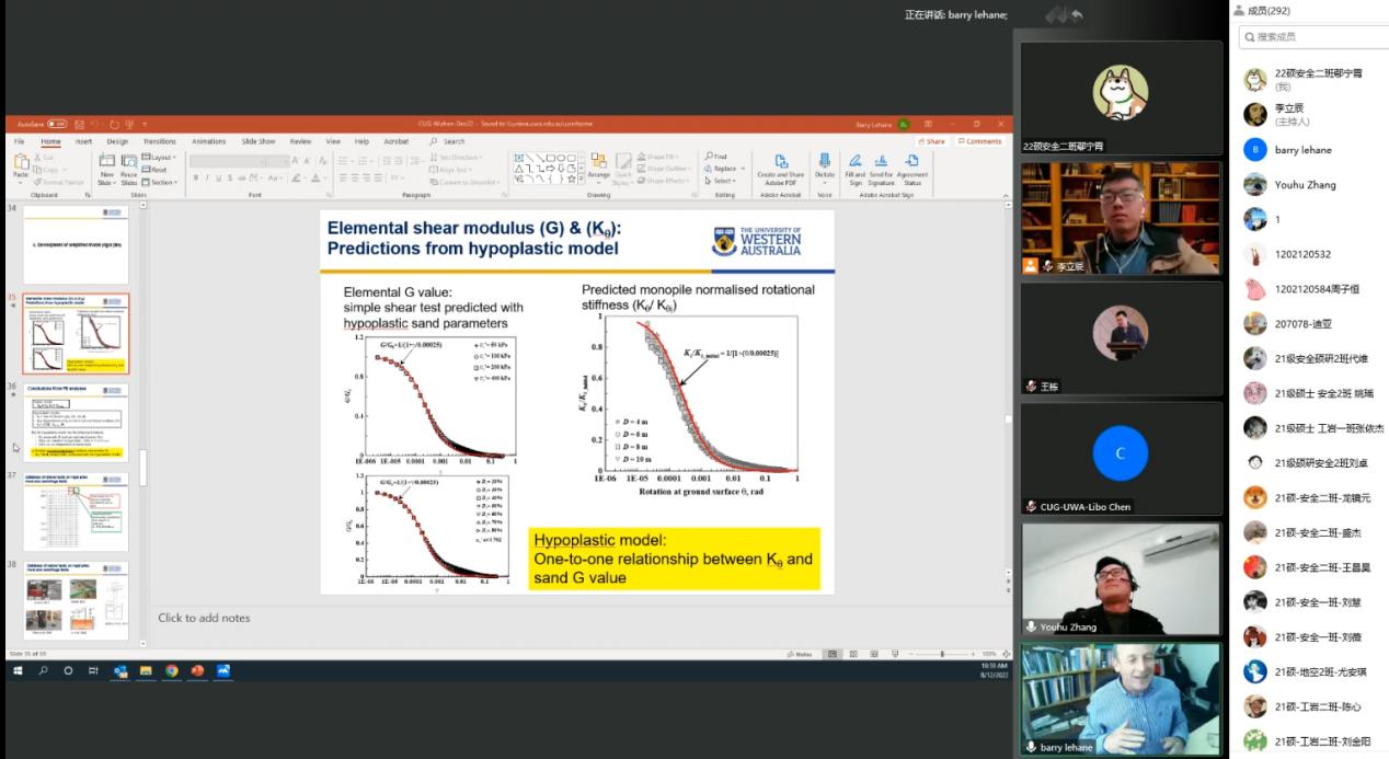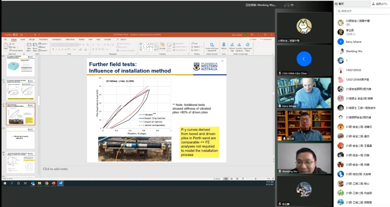 (通讯员 李立辰 黄静)12月8日上午,应Beat365正版唯一官网必一吴文兵教授与李立辰博士的邀请,西澳大学Barry Lehane教授做客工程文化论坛,为Beat365官网师生进行线上学术报告。此活动为Beat365正版唯一官网必一(武汉)70周年校庆系列学术活动之一。Beat365正版唯一官网必一勘察与基础工程系博士后李立辰主持报告,300余名师生与行业专家参加了本次活动。