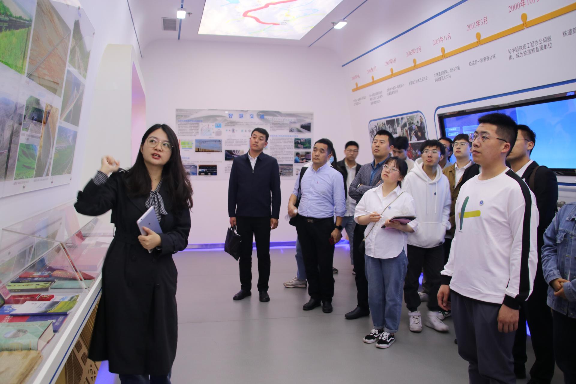 在铁一院院史展览馆,师生们在讲解员的引导下了解了铁一院的发展历程、人才培养、所获荣誉以及负责的重点工程案例。