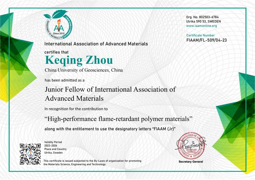 (通讯员 黄静)近日,Beat365正版唯一官网必一(武汉)Beat365正版唯一官网必一周克清特任教授收到国际先进材料学会(International Association of Advanced Materials, IAAM)执委会发来的贺函,祝贺他当选为国际先进材料学会青年会士(Junior Fellow of IAAM, FIAAM)。周克清特任教授受邀在美国奥兰多举办的复合材料研讨会(Composite Materials Congress)上发表题为“Functionalized 2D molybdenum disulphide working on high-performance flame-retardant polymer materials”的IAAM Fellow演讲,会上获颁青年会士“Junior Fellow”证书,以表彰他在“高性能阻燃聚合物材料”领域做出的杰出贡献。