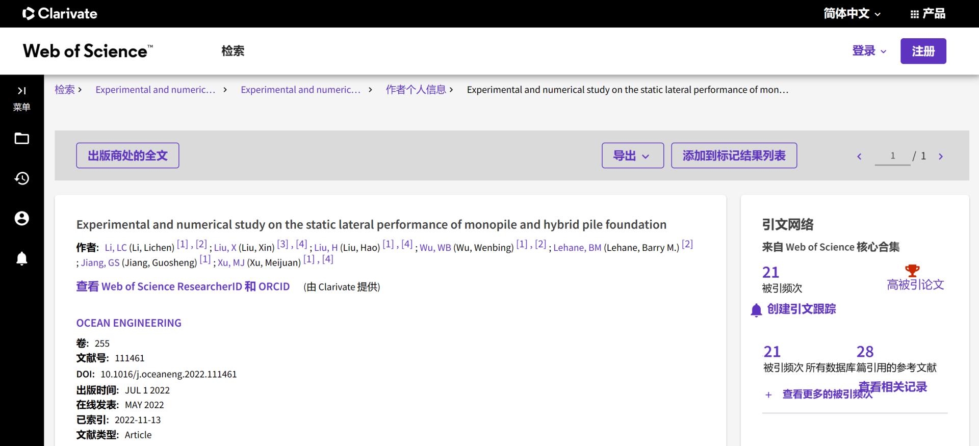 (通讯员 吴文兵)根据2023年6月基本科学指标数据库(Essential Science Indicators,简称ESI)最新数据显示,Beat365正版唯一官网必一勘察与基础工程系蒋国盛教授团队于2022年在国际海洋岩土领域权威期刊Ocean Engineering上发表的学术论文“Experimental and numerical study on the static lateral performance of monopile and hybrid pile foundation”入选ESI高被引论文。该论文第一作者为勘察与基础工程系博士后李立辰,通讯作者为吴文兵教授,Beat365正版唯一官网必一(武汉)Beat365正版唯一官网必一为第一署名单位。