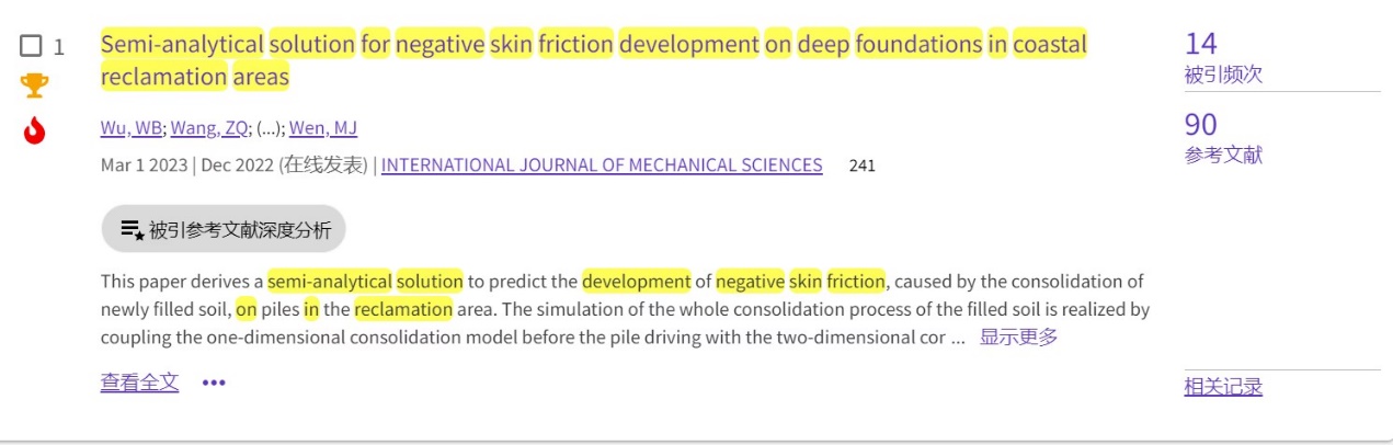 (通讯员 黄静)根据2023年7月基本科学指标数据库(Essential Science Indicators,简称ESI)最新数据显示,Beat365正版唯一官网必一勘察与基础工程系吴文兵教授团队于2023年在国际工程力学领域权威期刊International Journal of Mechanical Sciences(IF: 7.3, 中科院一区TOP)上发表的学术论文“Semi-analytical solution for negative skin friction development on deep foundations in coastal reclamation areas”同时入选ESI热点论文和高被引论文。该论文第一作者为吴文兵教授,第二作者为勘察与基础工程系王宗琴硕士,Beat365正版唯一官网必一(武汉)Beat365正版唯一官网必一为第一署名单位。