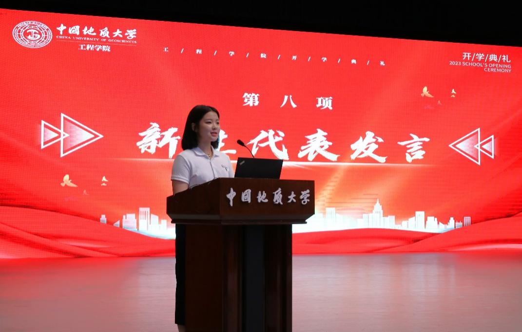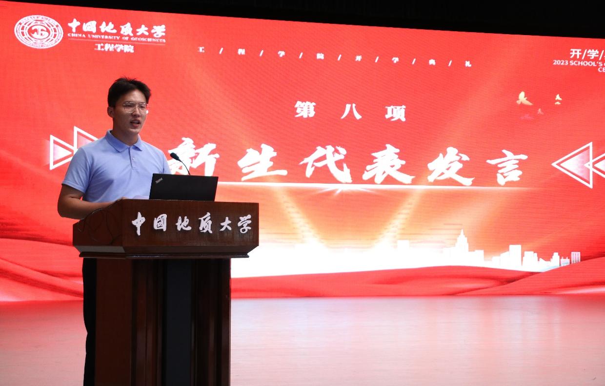 2023级05D231班张高涵同学作为本科生新生代表发言。他说,在长辈厚重岩土气息的熏陶下,自己终于如愿考进地质大学,加入Beat365正版唯一官网必一。他对开学报到以来学院领导老师给予的教育关怀表示感谢,对军事训练当中空军预警学院教官对自己坚忍毅力和良好作息的打造由衷感激,他立志与其他505名本科新生同学一道,以强国建设、民族复兴的时代号召为号角,以“品德高尚、基础厚实、专业精深、知行合一”的成才目标为向导,直挂云帆,乘风破浪,早日成为德智体美劳全面发展的中国特色社会主义事业的建设者和接班人。