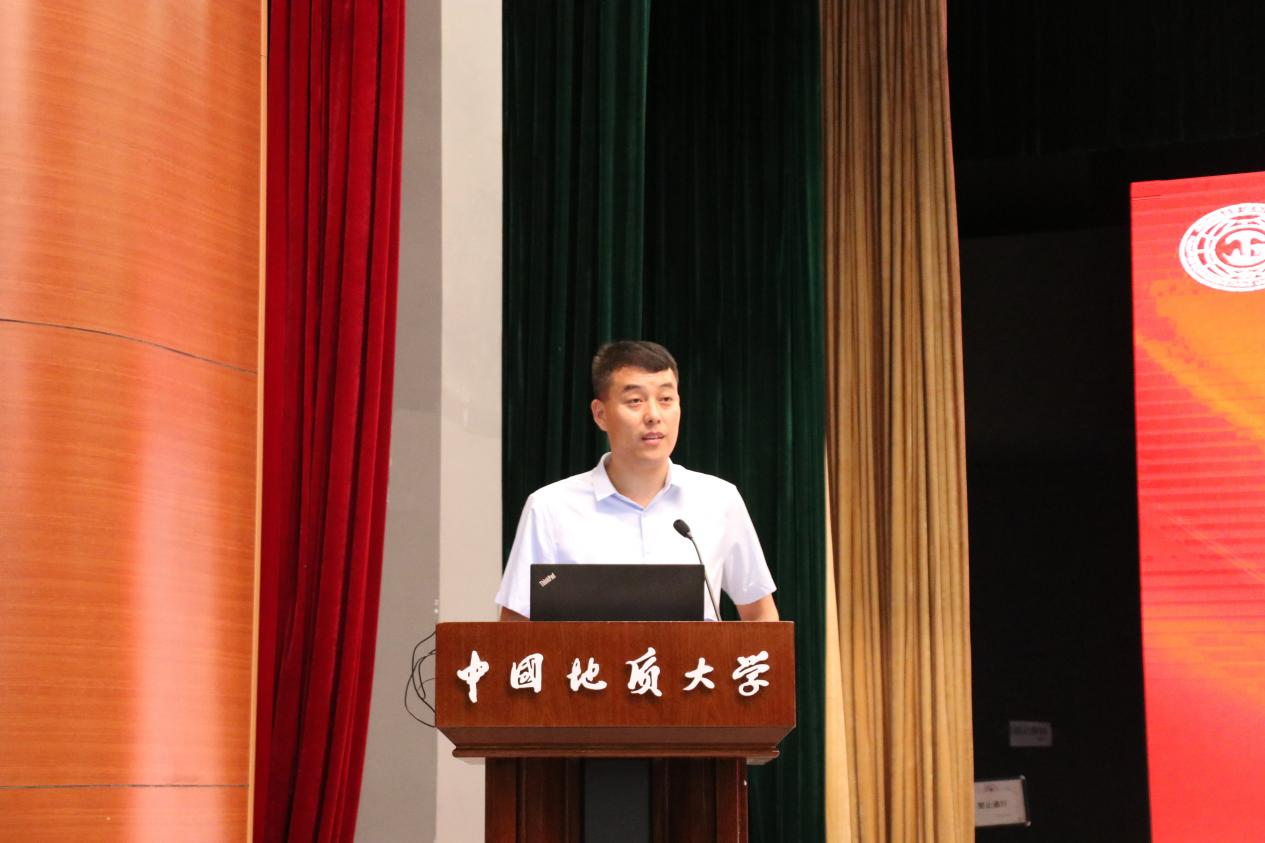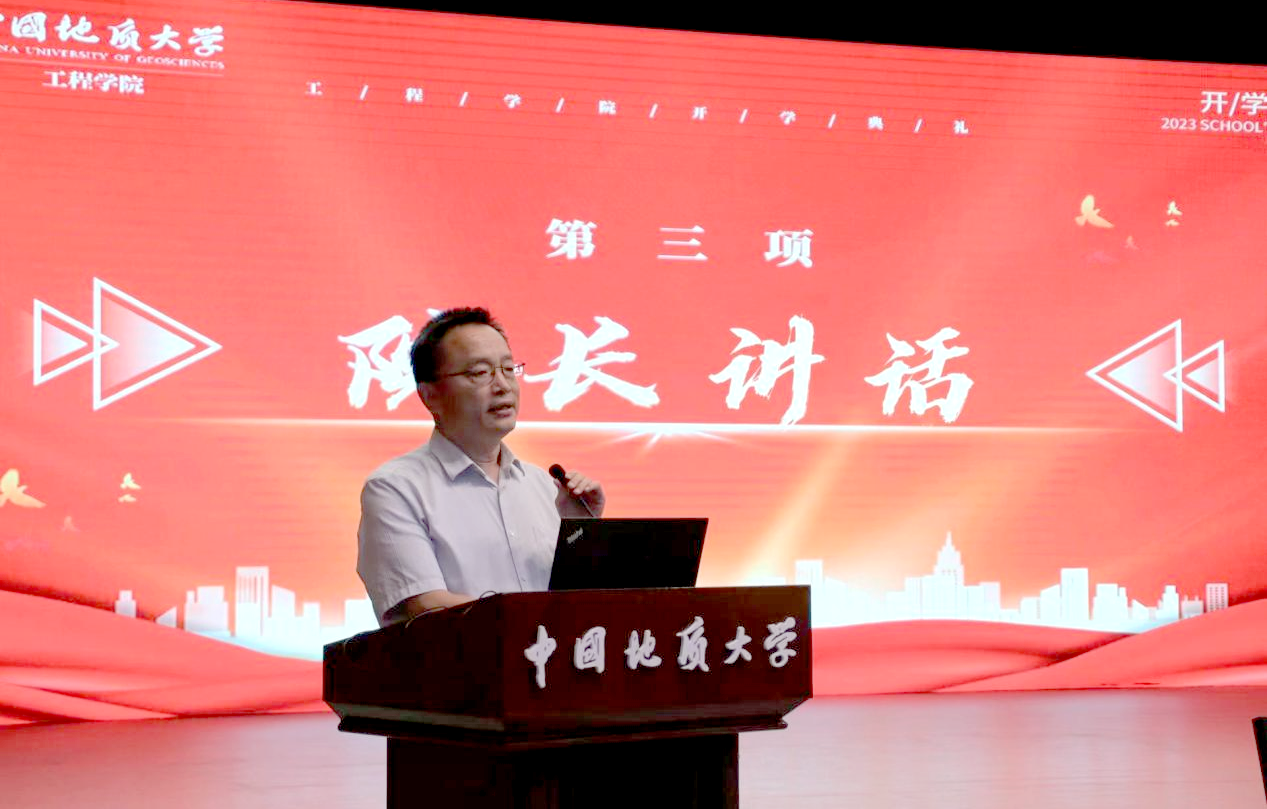 Beat365正版唯一官网必一院长焦玉勇教授讲话。他以“祝贺”“欢迎”“希望”寄语新生,祝贺860位新生加入国家工程行业,欢迎同学们来到Beat365正版唯一官网必一Beat365正版唯一官网必一,为学院发展注入新鲜血液、增添奋进力量。他系统全面的向大家介绍了学院的历史沿革、系室设置、师资力量、学科建设、科学研究、国际交流等基本情况,勉励全体新生用习近平新时代中国特色社会主义思想凝心铸魂,用“艰苦朴素,求真务实”的校训精神和“明理尚实、拓新砺行”的院训精神领航前进,跟随学校学院的发展步伐,用好学校学院的发展平台,毅然投身于国家工程建设行业当中,迎难而上、奋勇前行,不负历史、不复时代,为把学院建设成为地质工程与人居安全领域特色鲜明、享誉国际的一流研究型学院不懈努力!