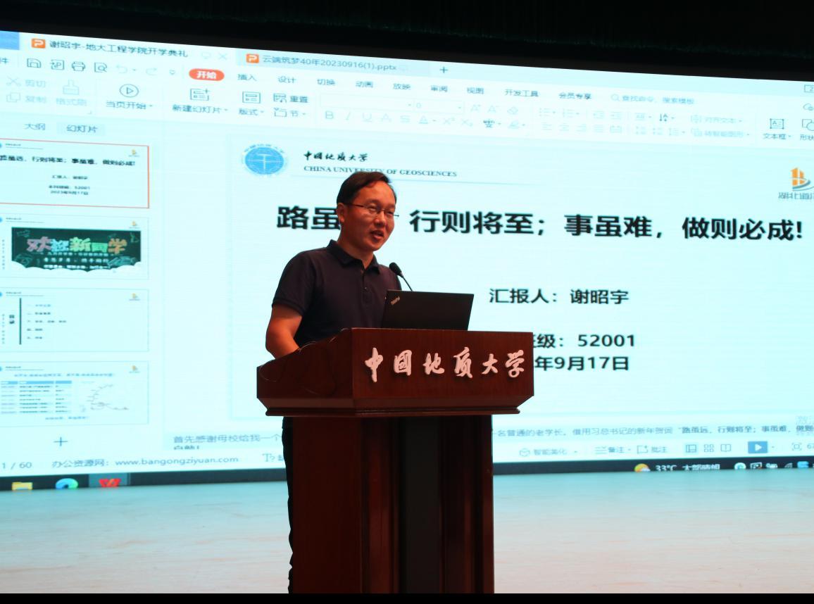 湖北道泽勘测设计院有限公司总工程师谢昭宇先生作为优秀校友代表发言。他以《路虽远,行则将至;事虽难,做则必成》为题,如数家珍地细数自己在地大求学之路上的点点滴滴,详实生动地介绍自己职场奋进之路上的酸甜苦辣,他从学历、注册、职称、创新、创业等五个方面给予学弟学妹们最真诚的建议,强调要锻炼强健体魄,勇敢应对生活挑战;要夯实专业知识,积极应对学业挑战;要参加实践活动,提前做好职场准备。谢校友的分享真诚而有趣,更加激发了同学们探索大学生活的热情。