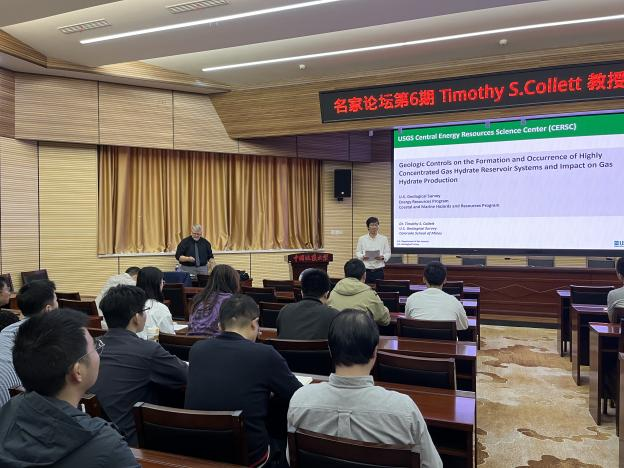 Timothy Collett教授对Beat365官网的诚挚邀请表示衷心感谢,并作了题为“Geologic controls on the formation and occurrence of highly concentrated gas hydrate reservoir systems and impact on gas hydrate production”的精彩报告。报告详细介绍了天然气水合物基础知识,对天然气水合物油气系统勘探情况进行了详细分析,以实例的形式系统总结了美国墨西哥湾、中国南海、日本南海海槽、韩国郁陵盆地和印度KG盆地的水合物勘探和开采情况,并对美国阿拉斯加冻土区前期和当前正在开展的水合物调查及试采情况进行了分享。最后,结合其丰富的现场调查研究经验,对未来水合物产业化开发面临的关键技术难题和研究方向进行了展望,并积极鼓励与会人员就报告内容开展交流和讨论。