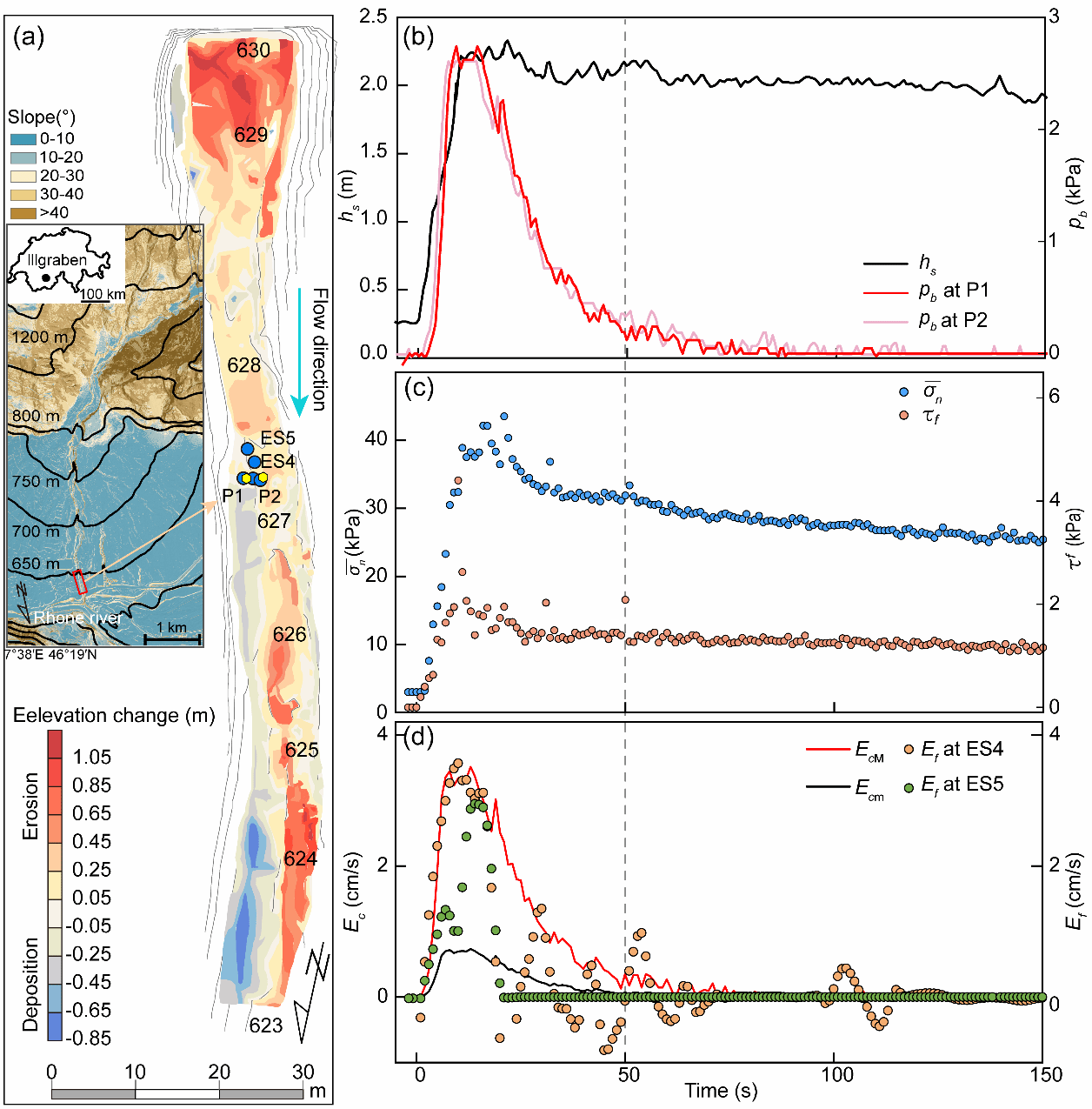 针对这一问题,郑鸿超特任教授基于Coulomb准则建立了考虑基底剪应力、碰撞应力和基床孔隙流体压力发展的泥石流侵蚀力学模型,并通过室内试验和Illgraben流域实测数据验证了该模型的有效性。结果表明:(1)对于潮湿沟床,由于高孔隙流体压力的发展,基底剪切和碰撞应力共同控制着泥沙侵蚀;对于干燥沟床,仅碰撞应力对泥沙侵蚀起控制作用,根本原因在于基底剪应力不足以克服剪切阻力;(2)对于剪切驱动的侵蚀沟床,孔隙流体压力通过降低剪切阻力促进侵蚀;对于碰撞驱动的侵蚀沟床,孔隙流体压力则通过增加其劈裂深度促进侵蚀。