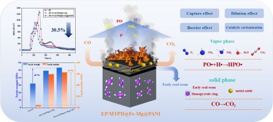 论文以金属卟啉有机框架为研究对象,基于“多元素协同阻燃”“界面工程”等策略,利用“接枝反应”“螯合作用”“原位生长”等理论与方法,合成一种新型双金属卟啉有机框架衍生物(MTPD@Fe-Mg@PANI)。得益于过渡金属的催化炭化、致密炭层的屏障作用、含磷自由基的捕获效应和不可燃气体的稀释作用,2 wt%添加量即可赋予EP复合材料优异的阻燃性能和出色的机械性能。其中热释放率峰值降低 30.5%、总烟释放量降低 20.7%、CO释放率峰值降低 67.3%。同时,归因于卟啉分子间π-π堆叠相互作用以及纳米粒子(PANI)与EP链之间的分子键合,复合材料的拉伸强度提升 66.7%、拉伸模量提升 55.7%,断裂伸长率提升 25.8%。