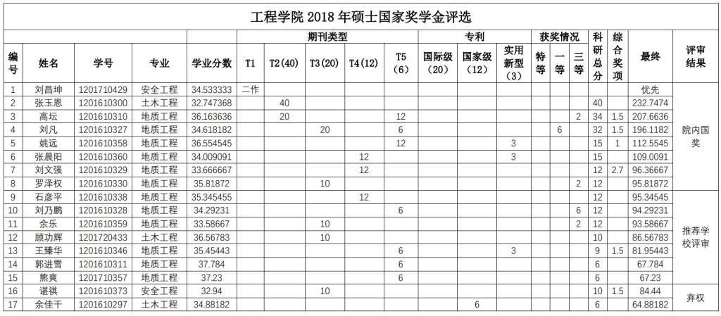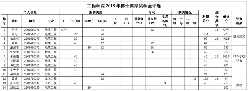 经个人申报,学院研究生国家奖学金评审委员会秘书处资格审查,学院研究生国家奖学金评审委员会于2018年9月29日下午组织通过资格审查的申报者(其中博士研究生14人,硕士研究生17人)进行答辩评审,学院研究生国家奖学金监审委员会全程监督。会议确定了刘昌坤等8名硕士研究生,刘浩等4名博士研究生为Beat365正版唯一官网必一2018 年研究生国奖学金候选人。现将Beat365正版唯一官网必一 2018 年国家奖学金候选人公示(见下表)。