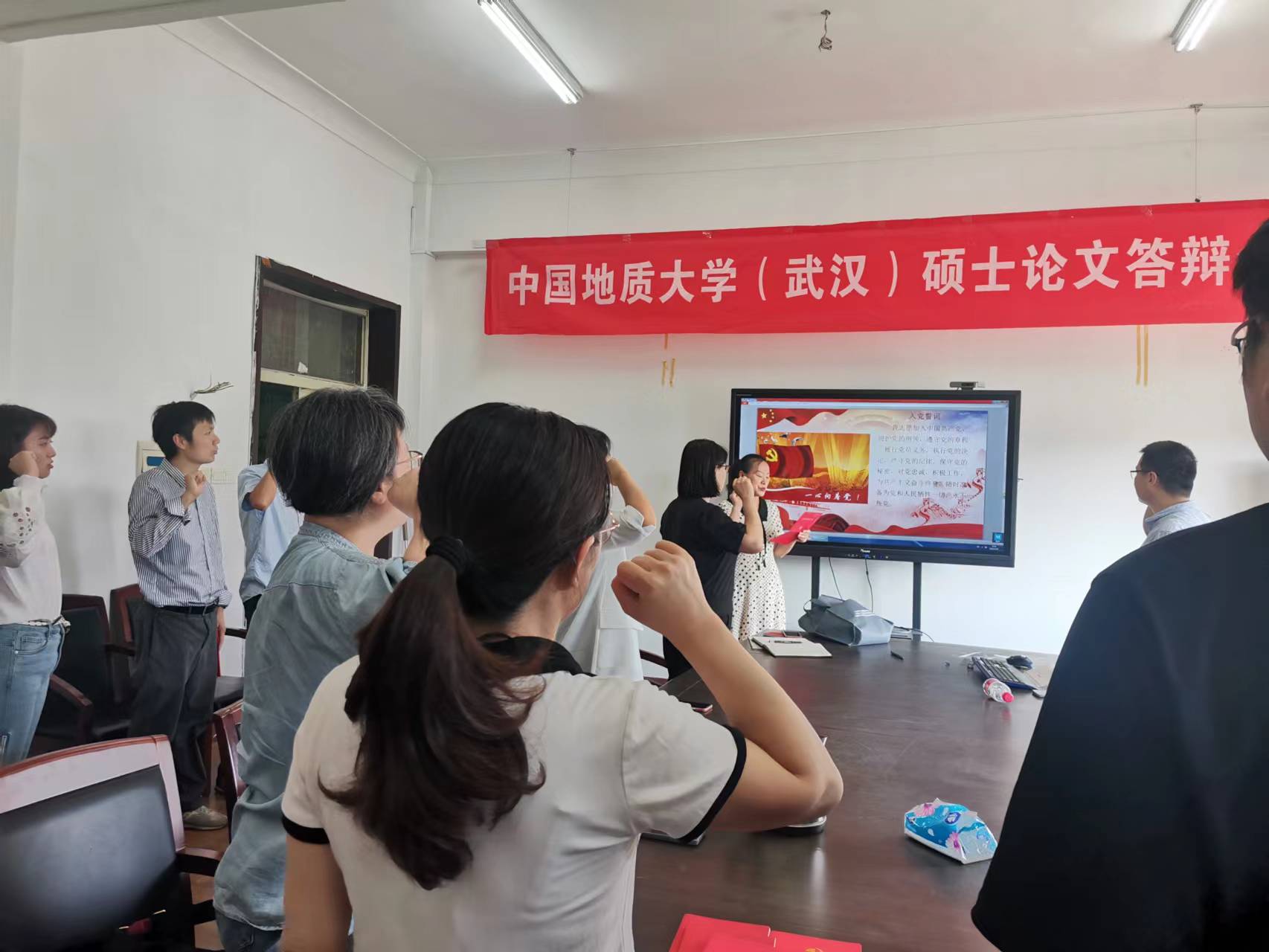 支部党员为王晓梅同志过“政治生日”,王晓梅同志带领大家重温了入党誓词。